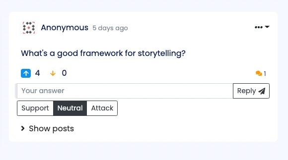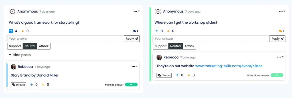 Als Moderator:in kannst du Beiträge als Referenzantwort markieren. Die entsprechende Frage wird dann mit einem grünen Rand markiert und die markierte Antwort automatisch angezeigt. Übersicht für dich und dein Publikum!