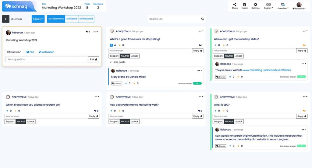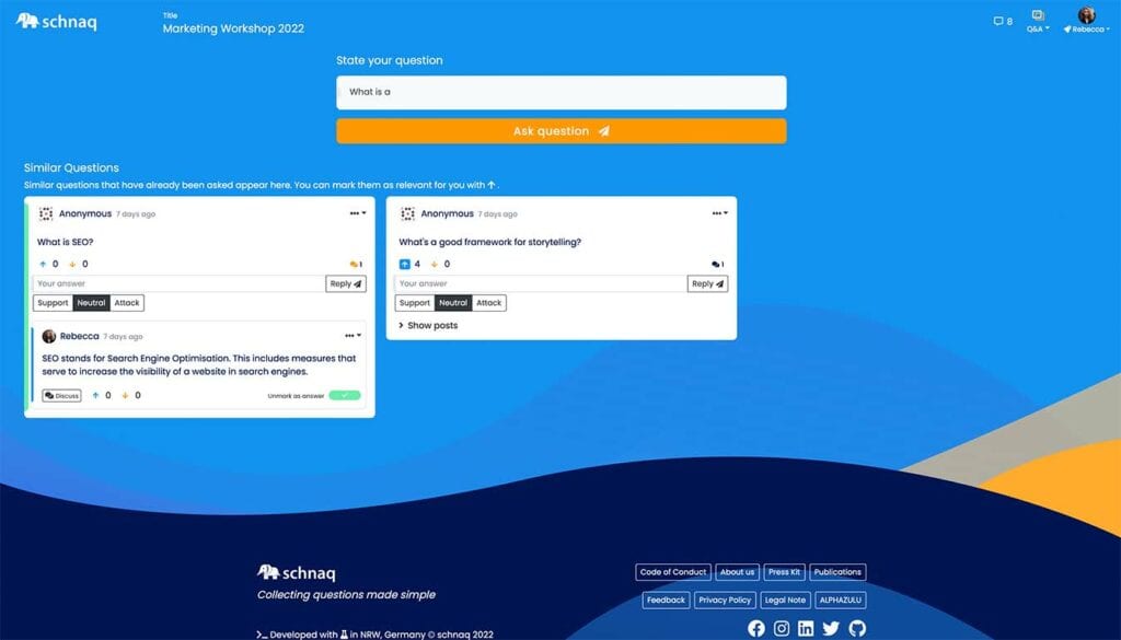 Manche Fragen brennen mehreren auf der Zunge. Mit einem Klick können deine Teilnehmer:innen Fragen als relevant oder irrelevant markieren. So werden dir die wichtigsten Fragen ganz oben in der Übersicht angezeigt.